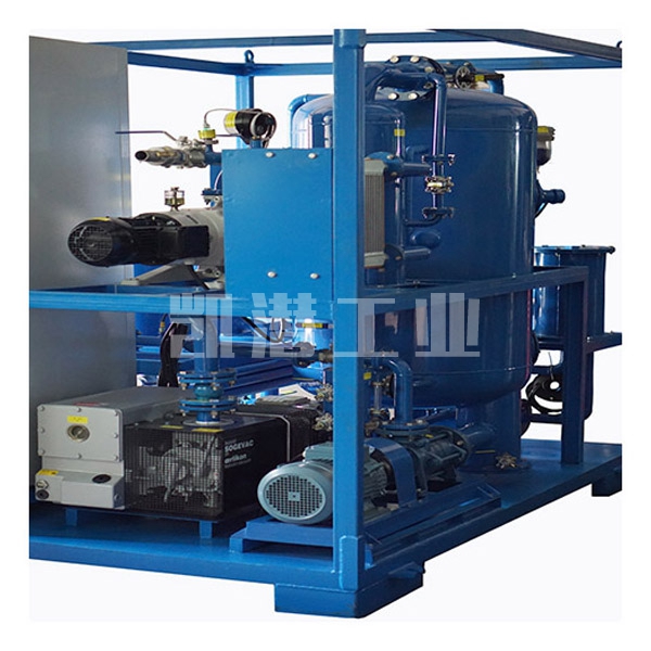 待處理的油經(jīng)過一級粗濾器后進入加熱器進行加熱,加熱后的油經(jīng)過第二級過濾器到螺旋噴淋霧化系統(tǒng),變?yōu)榇至lF狀下落到反應塔上進入真空分離室,水分即開始蒸發(fā),油霧在罐內(nèi)形成立體的多層面的蒸發(fā)結(jié)構(gòu),通過短時的循環(huán),便可達到凈化目的。經(jīng)過除雜質(zhì)、脫水、脫氣、除酸的油品在油泵的作用下經(jīng)過精密過濾器完成一個凈油工作循環(huán)。從真空分離室中分離出來的水蒸氣熱空氣進入冷疑器,大部分水蒸氣凝結(jié)為水存入積水倉,排出機外,油中熱空氣經(jīng)冷卻后由真空泵排出。